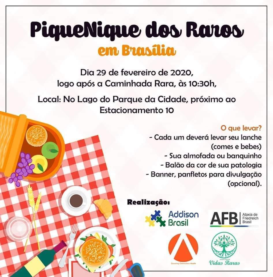 O dia mundial das doenças raras, visa a conscientização sobre as dificuldades dessa comunidade. Entre nós, terão pessoas e familiares que ainda não tem diagnóstico, assim como os que já trazem na suas caminhadas muitas vivências. O início da caminhada será no parque Ana Lídia as 9h e o término no parque da cidade, onde todos são convidados a levar seus acessórios para um Piquenique depois!